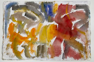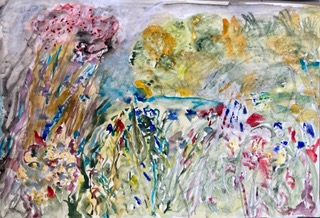 I began my first oil painting during the Autumn of 2021 on an a piece of ply wood board using a box of old oil paints that Di had had for years. From my experiments in painting in watercolour I had enjoyed making shorter and longer marks in varying directions to cause a build up of effects and energies from the original marks. And obviously Jackson Pollock was on my mind and a desire to break free of more obvious representational forms. I enjoyed making mistakes and rubbing or scratching out, I also splattered some ink about. I liked the result but I am not sure what anyone who views it will makes of it. Shortly after a friend gifted me some stretched canvas and I made my first attempt at a work on canvas inspired by the flowers at the garden where I volunteer. It turned into something more like a map. I enjoyed learning that you could scratch out, rub and adjust and how the application of one colour led to another, a very absorbing process. I still enjoy the vibrancies and juxtapositions of this painting and it certainly gave me the momentum to carry on with mark making and abstract intuitive painting, sometimes using a particular photo image or memory of a place as a starting point. Sketching and rapid watercolour work with nothing in mind has also informed my painting. What you see here now is the chronology of how things have been developing since those early experiments.