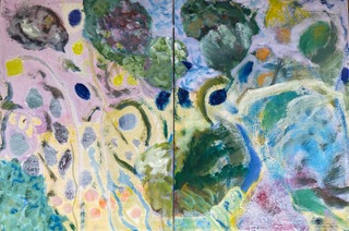 In the Spring of 2020, going into Covid lockdown, listening to the bad news and the mounting death tolls, I found great solace and a magical, almost overwhelming, quality in the coming of Spring…something I had experienced before on a return to our garden from a 7 day zen retreat. This connection with the onrush and surge of new life, had a huge and positive effect on me. Zen had also introduced me to some of Mayumi Oda’s bountiful flowing paintings of goddesses, their seeming joy and equanimity. I still love their Matisse like presences and under these influences I began painting a female figure representing Spring. This was my first attempt at painting since school. I was encouraged and advised by my wife, an accomplished artist and print maker. As you will see this is a somewhat primitive painting and the larger painting had help and input from my wife in working on the hands and face. This was the start of my adventures in art. My focus initially was on the garden and garden scenes from our kitchen windows. Eventually I found myself getting to really enjoy playing with colour and the flow of paint, juxtaposing colours and experimenting with colour on colour, my painting became more abstracted more intuitive. Sometimes I took a more deliberate and patterned approach though more recently I have had a daily practice of rapid, ‘splashabout’ painting. All of this has enabled me to transfer my discoveries into oil painting on canvas, and in using oils and mixed media on paper.