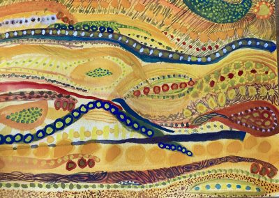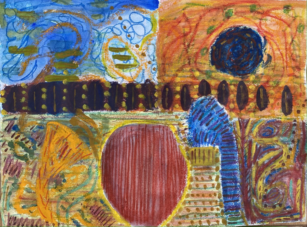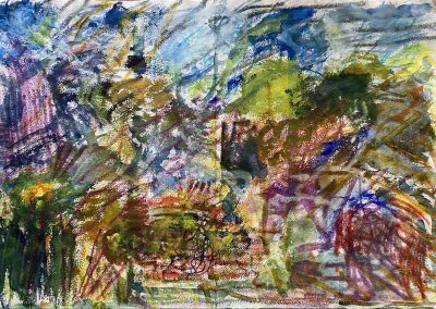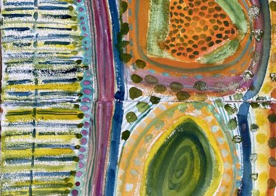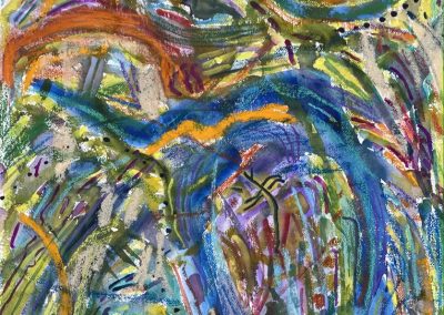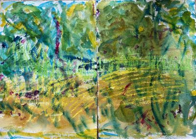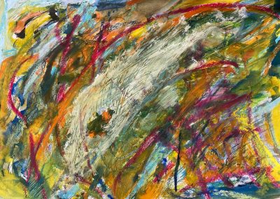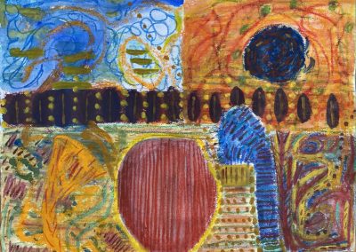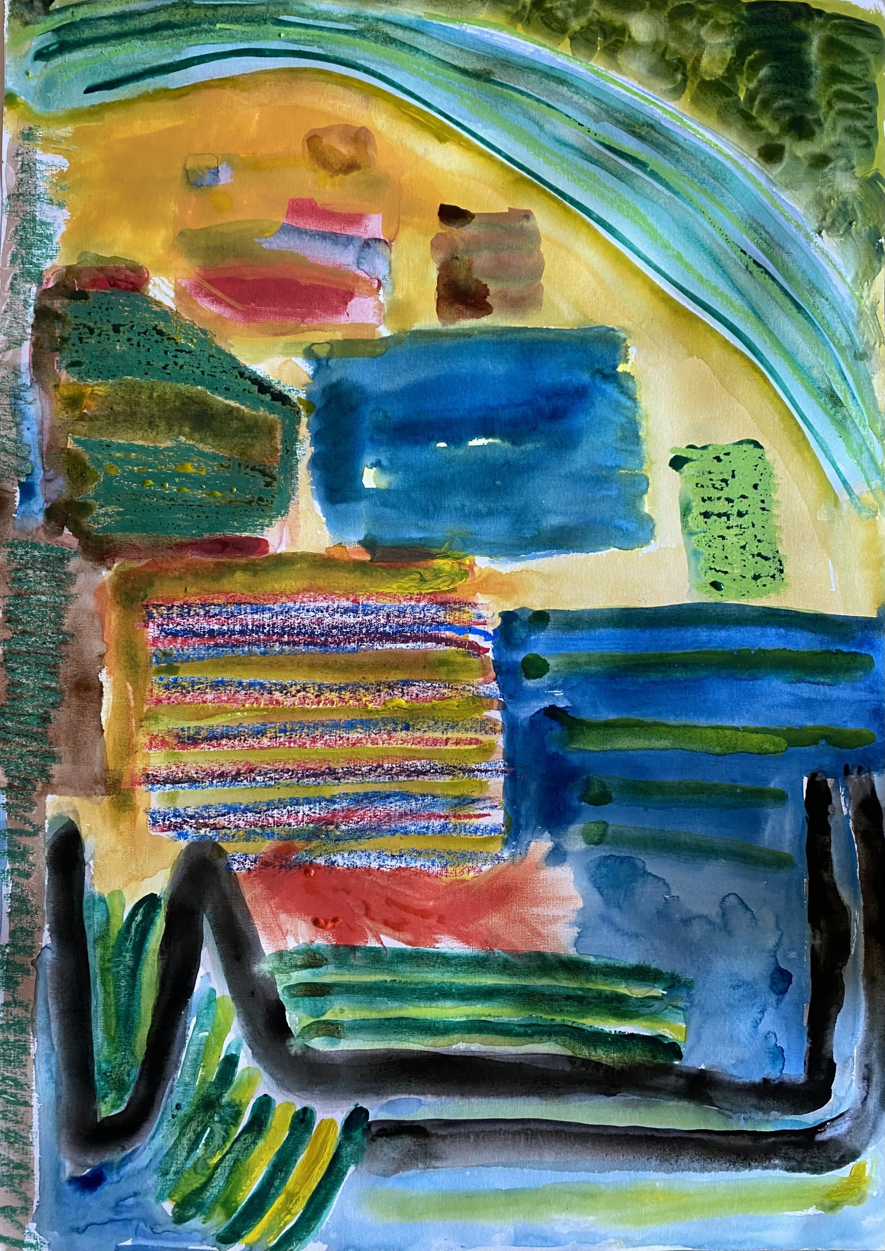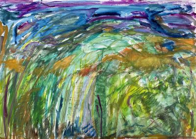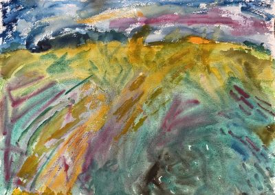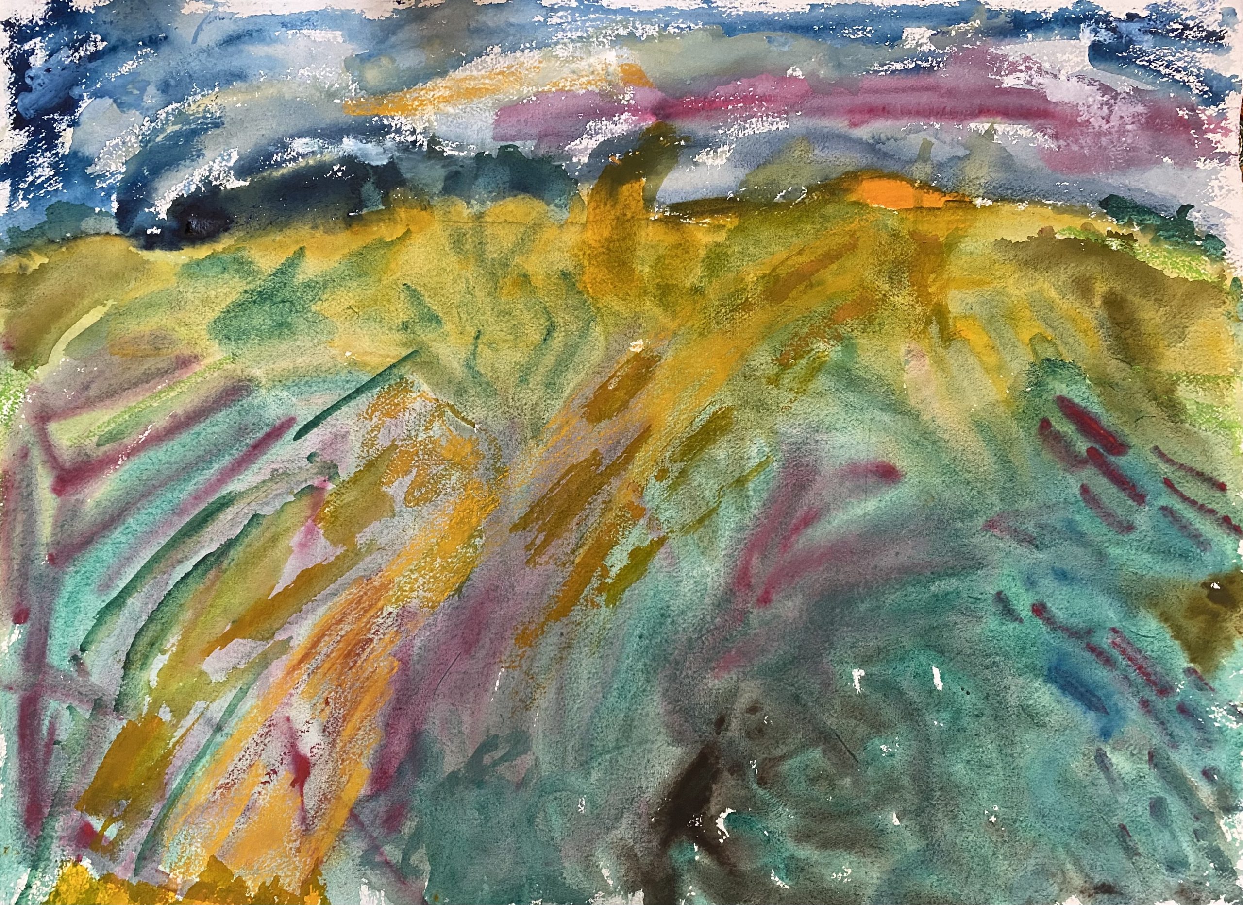 Over the Fields. Abstract landscape in watercolour and oil pastel on Khadi paper. 58 x77 cms. Jan ’25