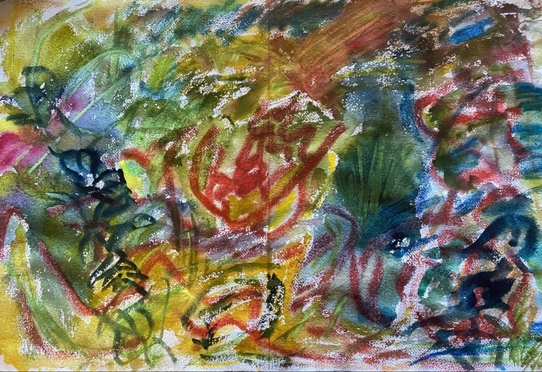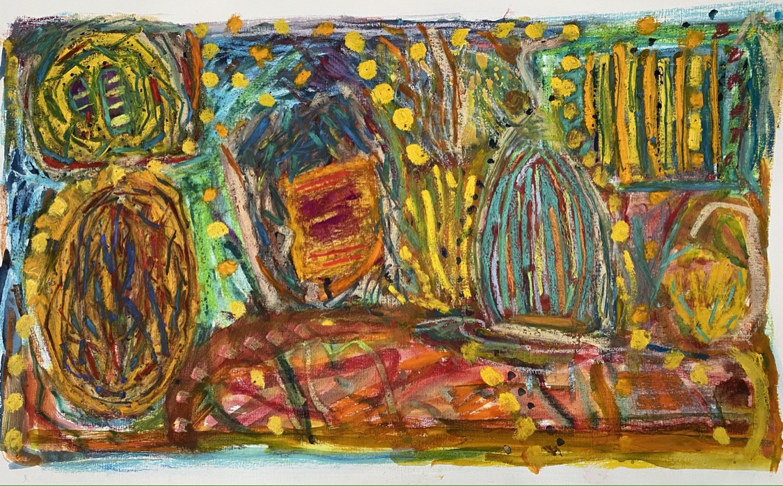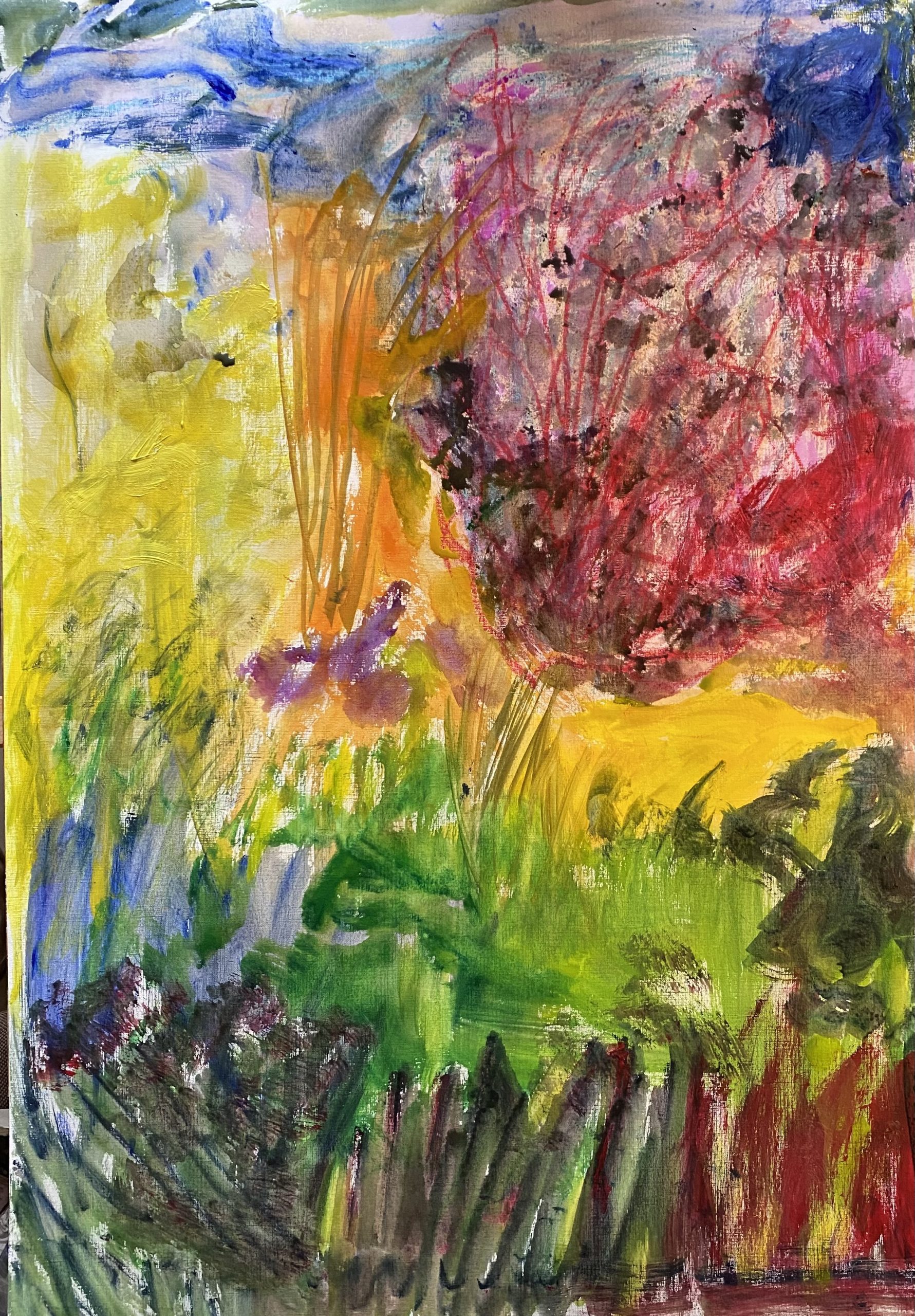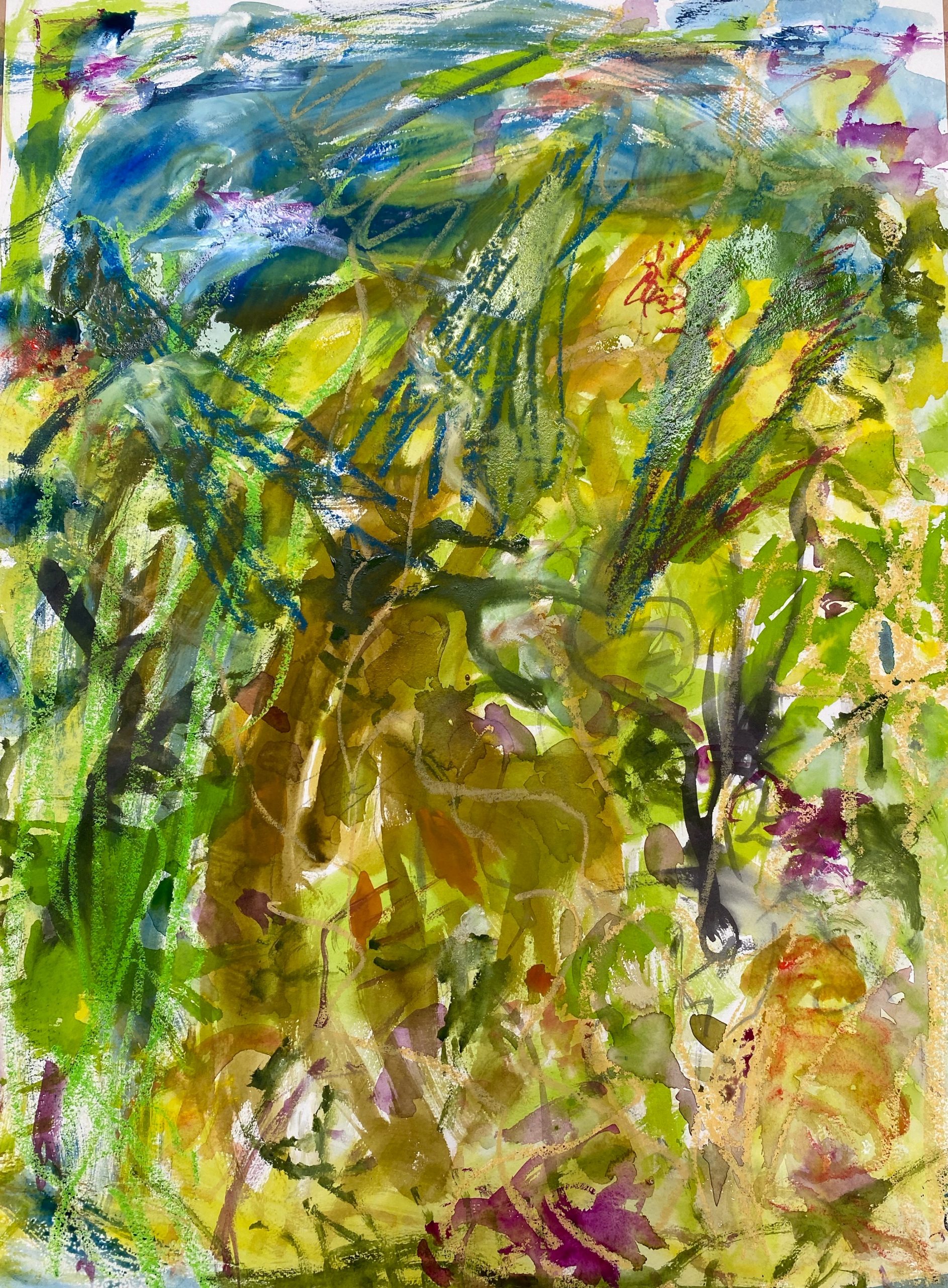 Abstract garden painting, mixed media on paper, 60 x 84 cms. Nov ’24.