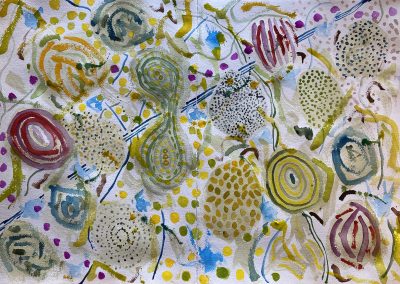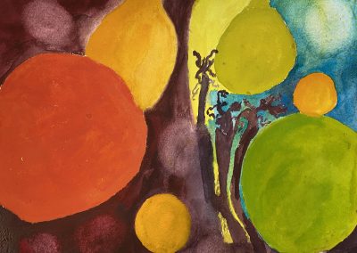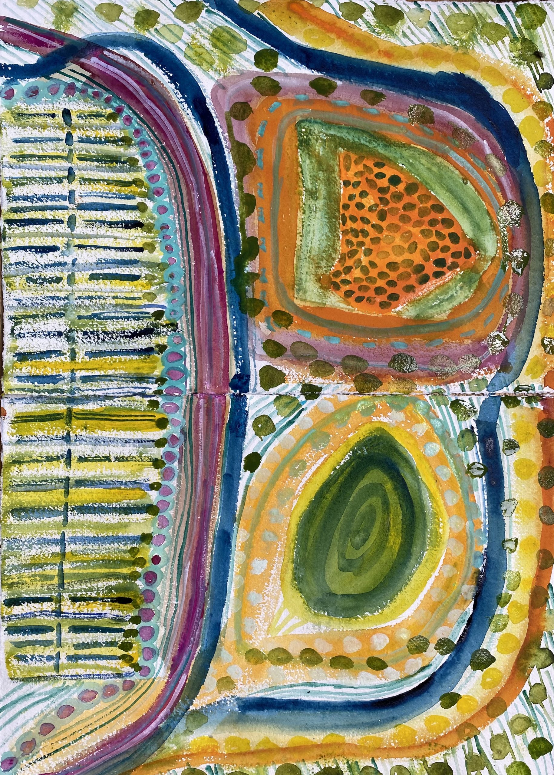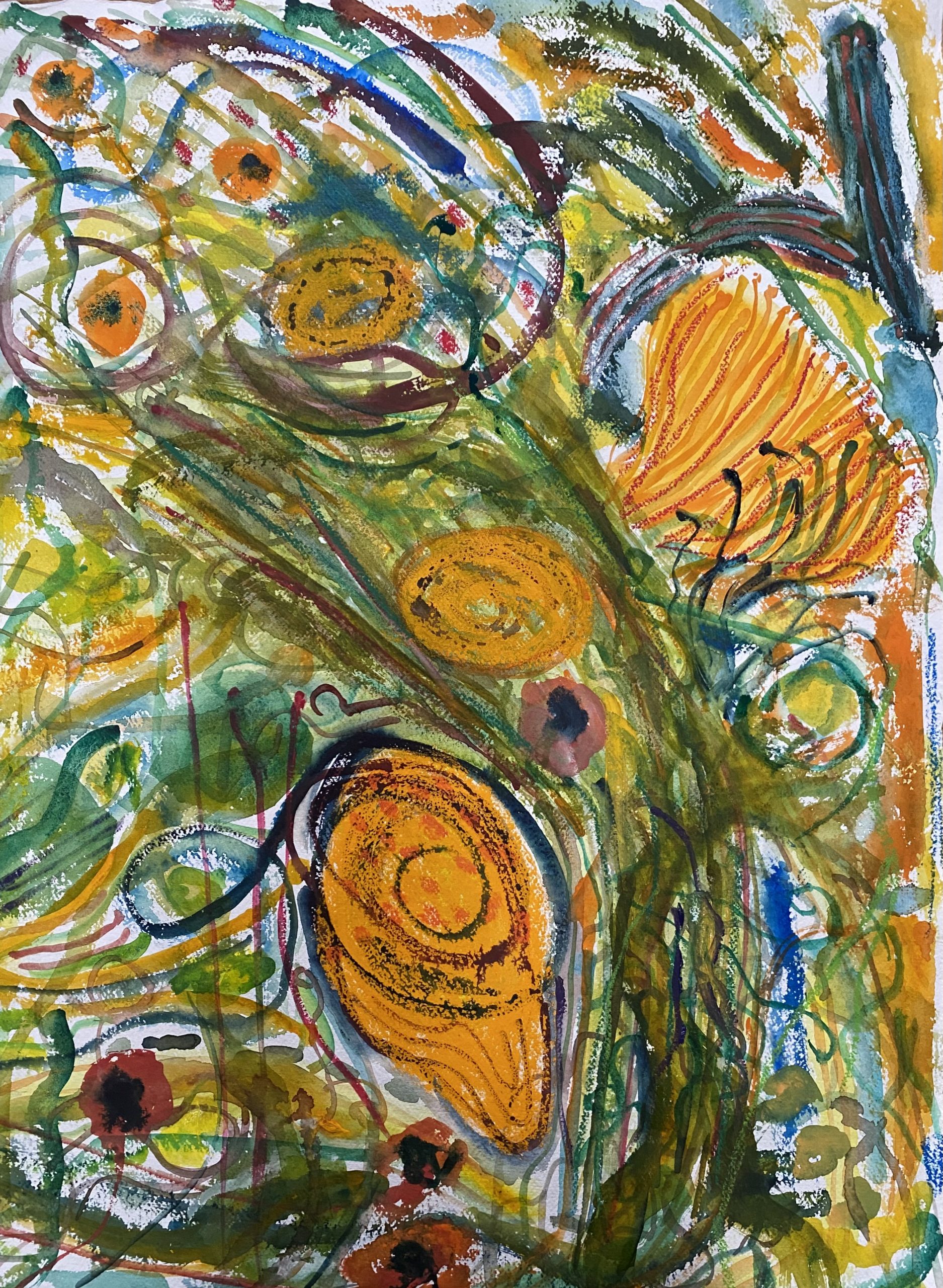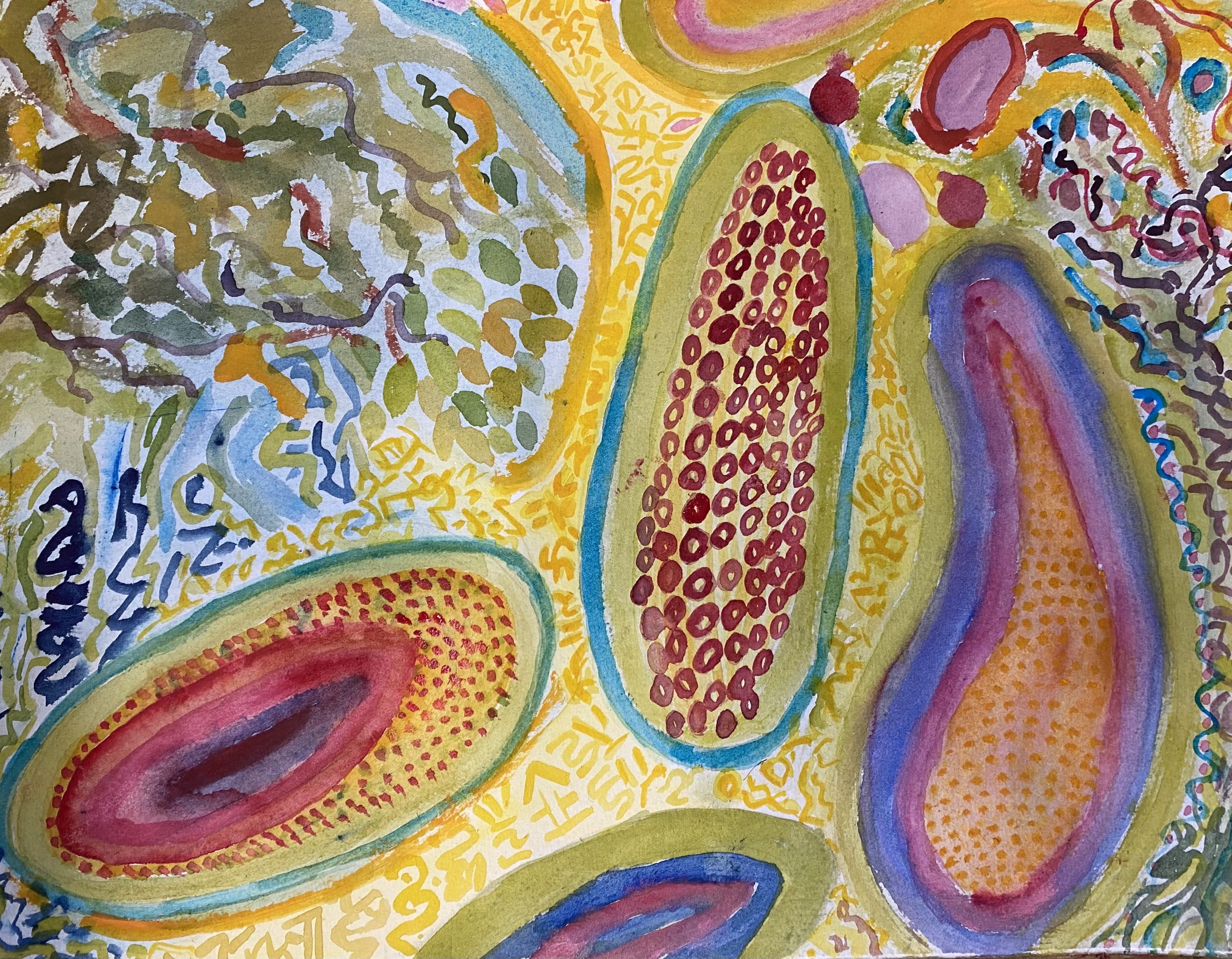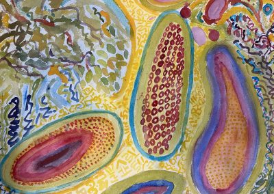 Abstract fruit forms, watercolour and gouache, 28 x 37 cms. Oct ’22.
