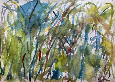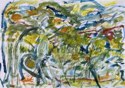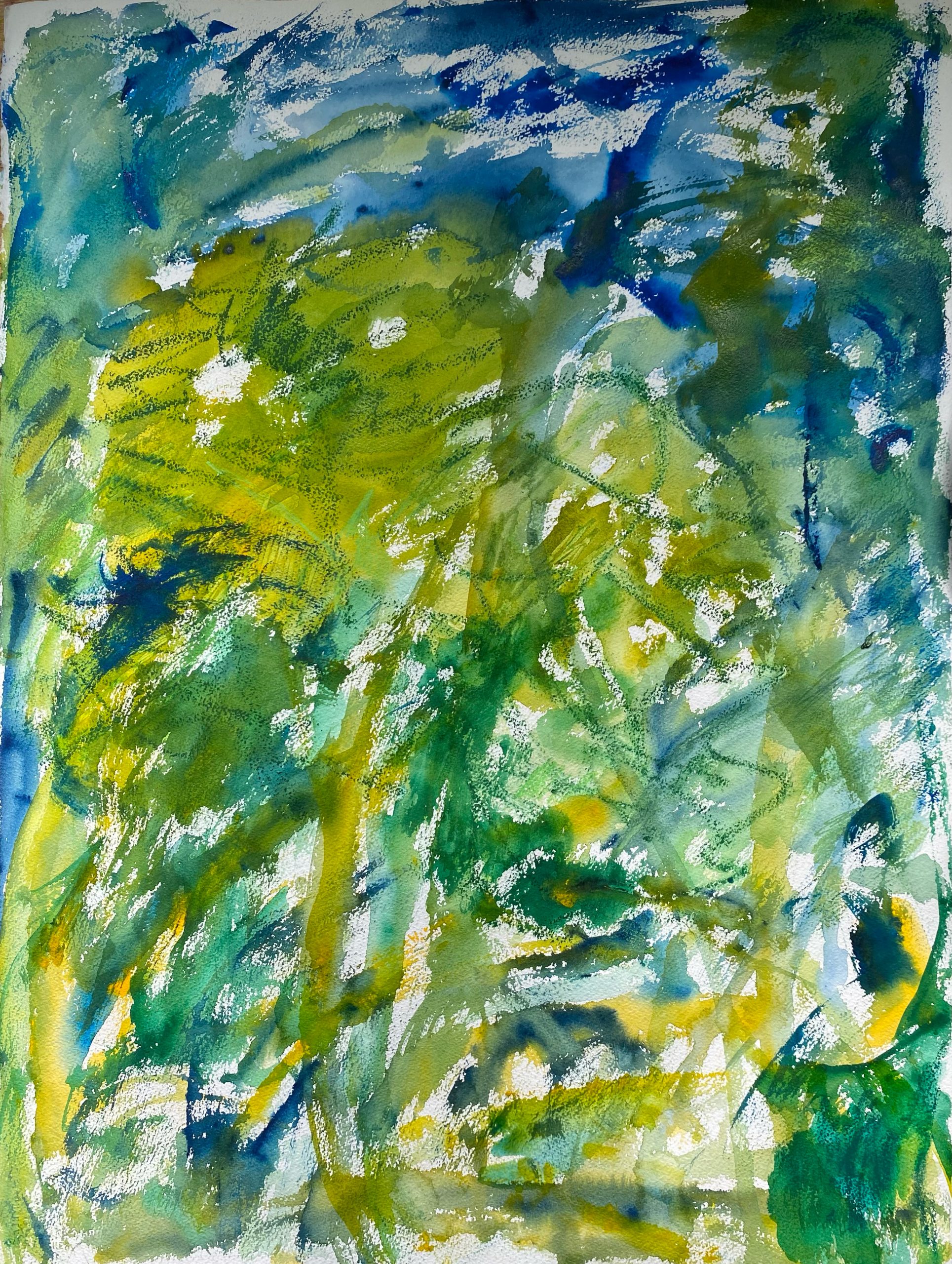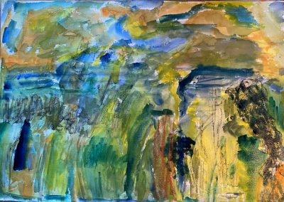 Abstract Landscape in blues and greens, watercolour and gouache on paper, 60 x84 cms. Nov ’24.