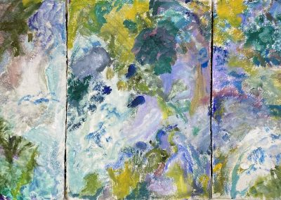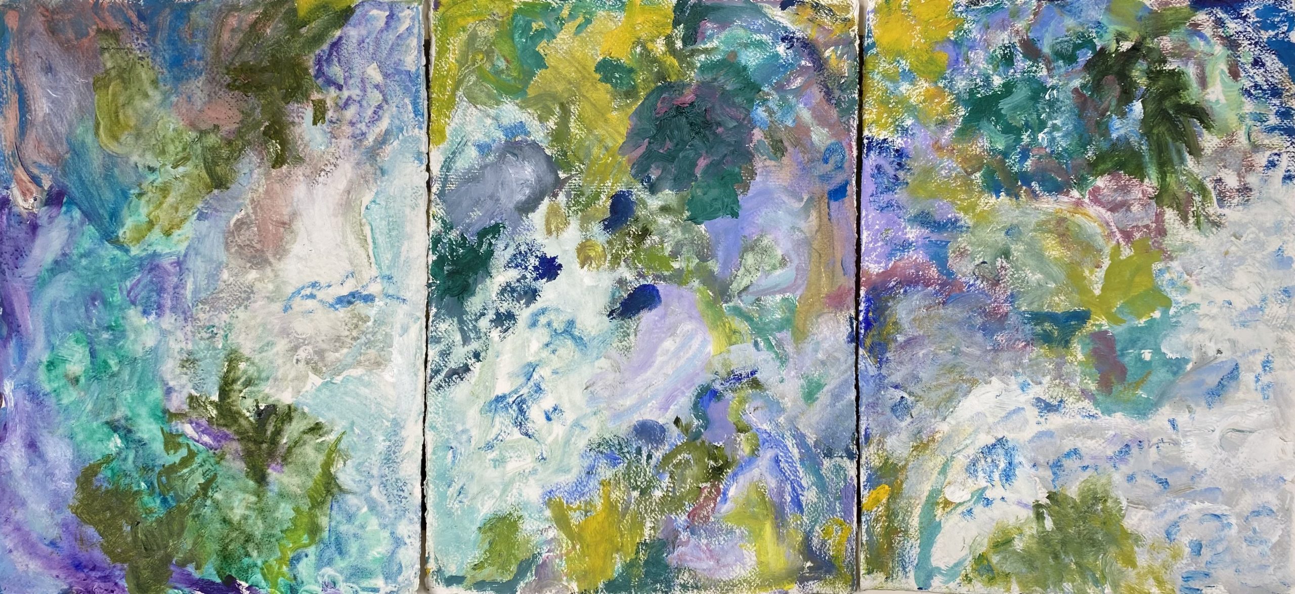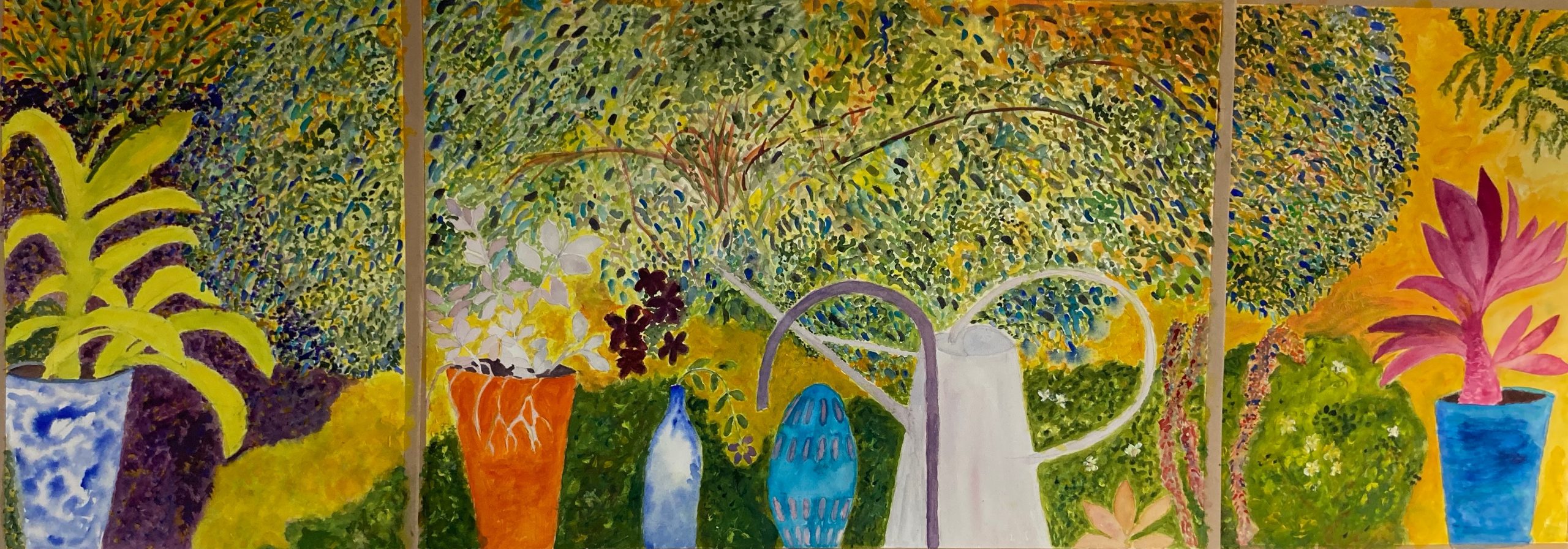 Through the Kitchen Window , mixed media triptych, 54 x 150 cms, August 2021.