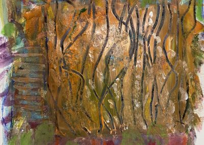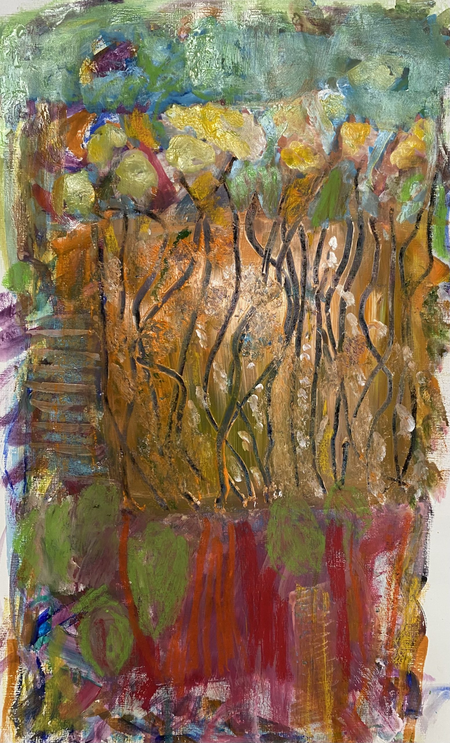 Tynninghame Woods. Abstract mixed media on Arches paper, 76 x56 cms. August 2025.
