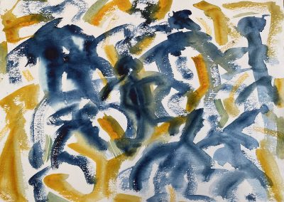 Dancing Forms – abstract in indigo and Indian red watercolour on Khadi paper, 60 x 84 cms. Dec ’24