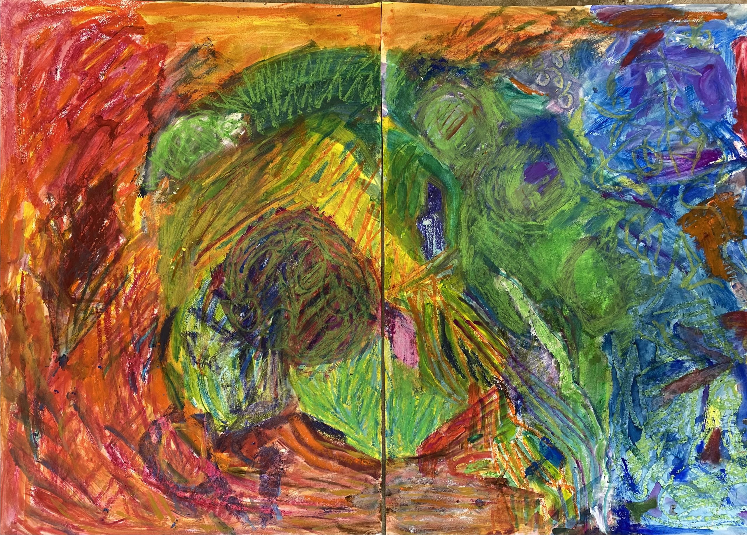 Abstract painting in gouache ane watercolour on two sheets of Khadi paper, 42 x 60 cms. Mar ’24.